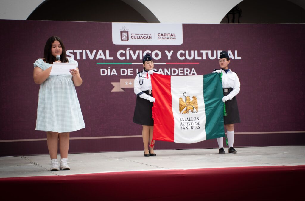 Culiacán, Sinaloa.- En el marco de la conmemoración del Día de la Bandera, se llevó a cabo el «Festival Cultural 24 de Febrero» en el patio del Ayuntamiento, un evento que reunió a diversas instituciones educativas y culturales para rendir homenaje al lábaro patrio.