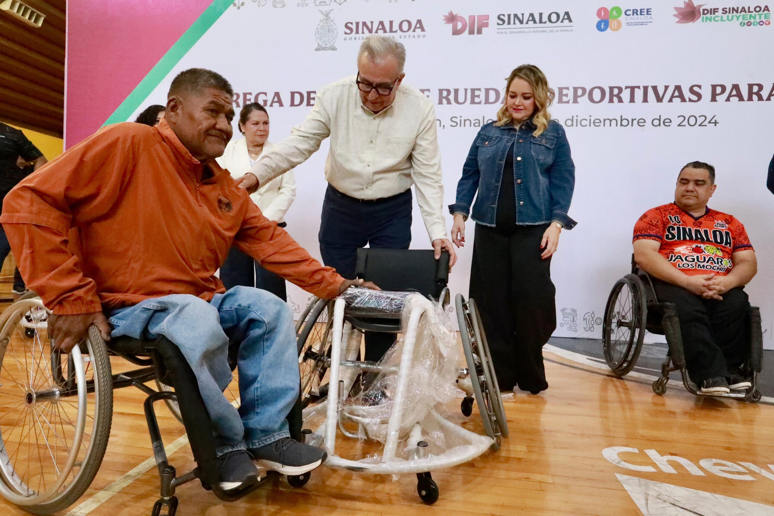 Culiacán, Sinaloa.- En una entrega histórica y sin precedente en todo el país, el gobernador Rubén Rocha Moya, junto con la presidenta del Sistema DIF Sinaloa, Eneyda Rocha Ruiz, hizo entrega de un total de 63 sillas de ruedas para el deporte adaptado de básquetbol, convirtiéndose Sinaloa en el único estado de México que ha realizado una entrega masiva en tal cantidad de estas sillas especiales.