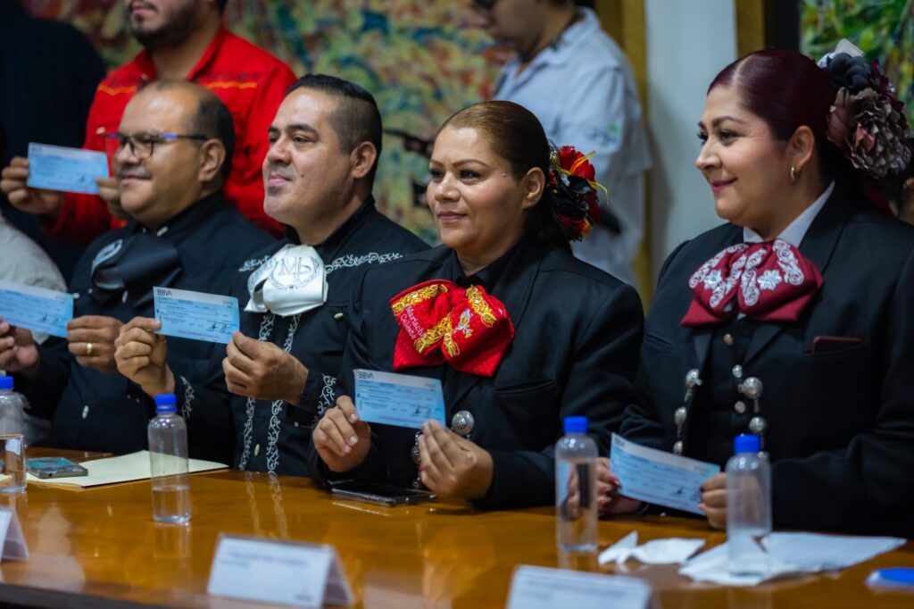 Culiacán, Sinaloa.- Comprometido en fortalecer y reactivar todos los sectores económicos y productivos sinaloenses, el Gobernador Rubén Rocha Moya, acompañado del Secretario de Economía, Ricardo Velarde y el alcalde de Culiacán Juan de Dios Gámez, a través del programa «Sinaloa Late Fuerte», hicieron entrega de apoyos económicos al gremio de los músicos, quienes han visto disminuidas sus presentaciones laborales en estos últimos meses, beneficiando a cerca de 811 integrantes de 102 agrupaciones de bandas, grupos norteños y mariachis de los municipios de Culiacán y Navolato.