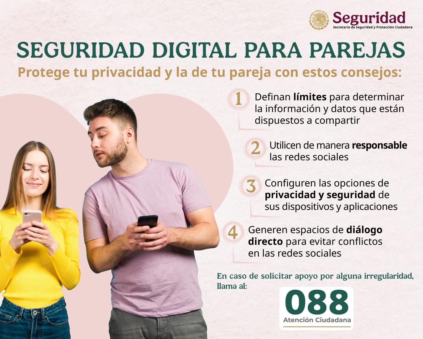 Ciudad de México. – Ante posibles riesgos que representa el compartir información personal como son contraseñas o perfiles de usuarios con la pareja u otras personas, la Secretaría de Seguridad y Protección Ciudadana (SSPC), a través de la Dirección General de Gestión de Servicios, Ciberseguridad y Desarrollo Tecnológico, emite recomendaciones para evitar ser víctima de algún delito.