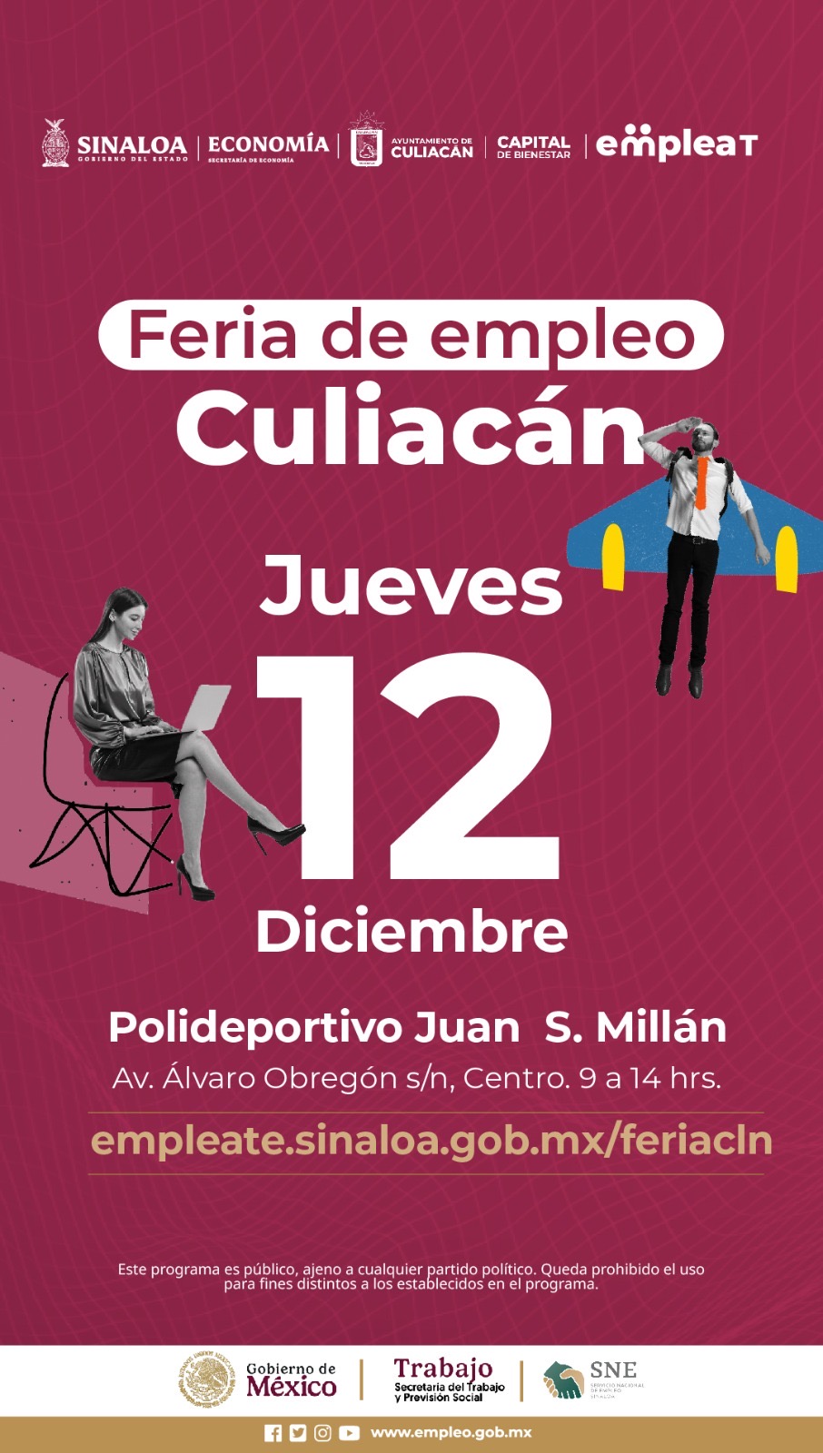 Culiacán, Sinaloa.- El Servicio Nacional del Empleo, Servicio Estatal del Empleo, en conjunto con la Secretaría de Desarrollo Económico Municipal, (SEDECOM), ofertará la última Feria de Empleo del 2024, este próximo jueves 12 de diciembre, en horario de 9:00 a 14 horas, en la sede del Polideportivo Juan S. Millán en Culiacán.