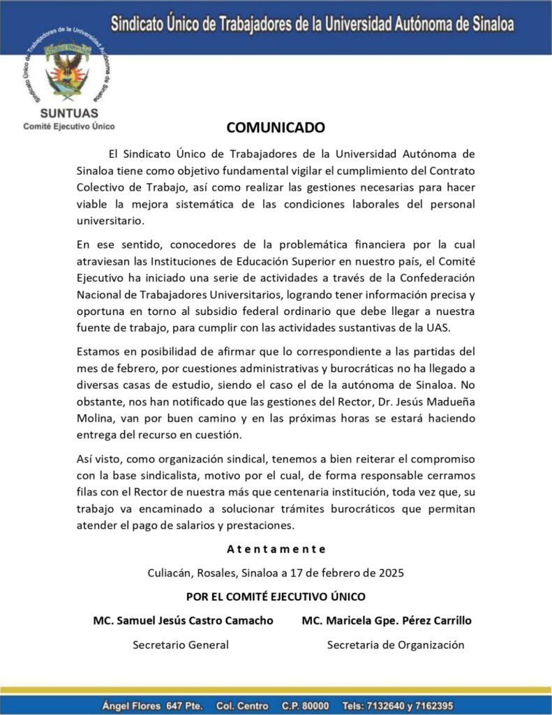 A través de un comunicado, el Sindicato Único de Trabajadores de la Universidad Autónoma de Sinaloa (SUNTUAS), por medio de su Comité Ejecutivo Único, reiteró su compromiso con la base trabajadora, cerrando filas de manera responsable con el Rector, doctor Jesús Madueña Molina, ante la gestión realizada ante la Federación para que aterricen los recursos para el pago de la primera quincena del mes de febrero.